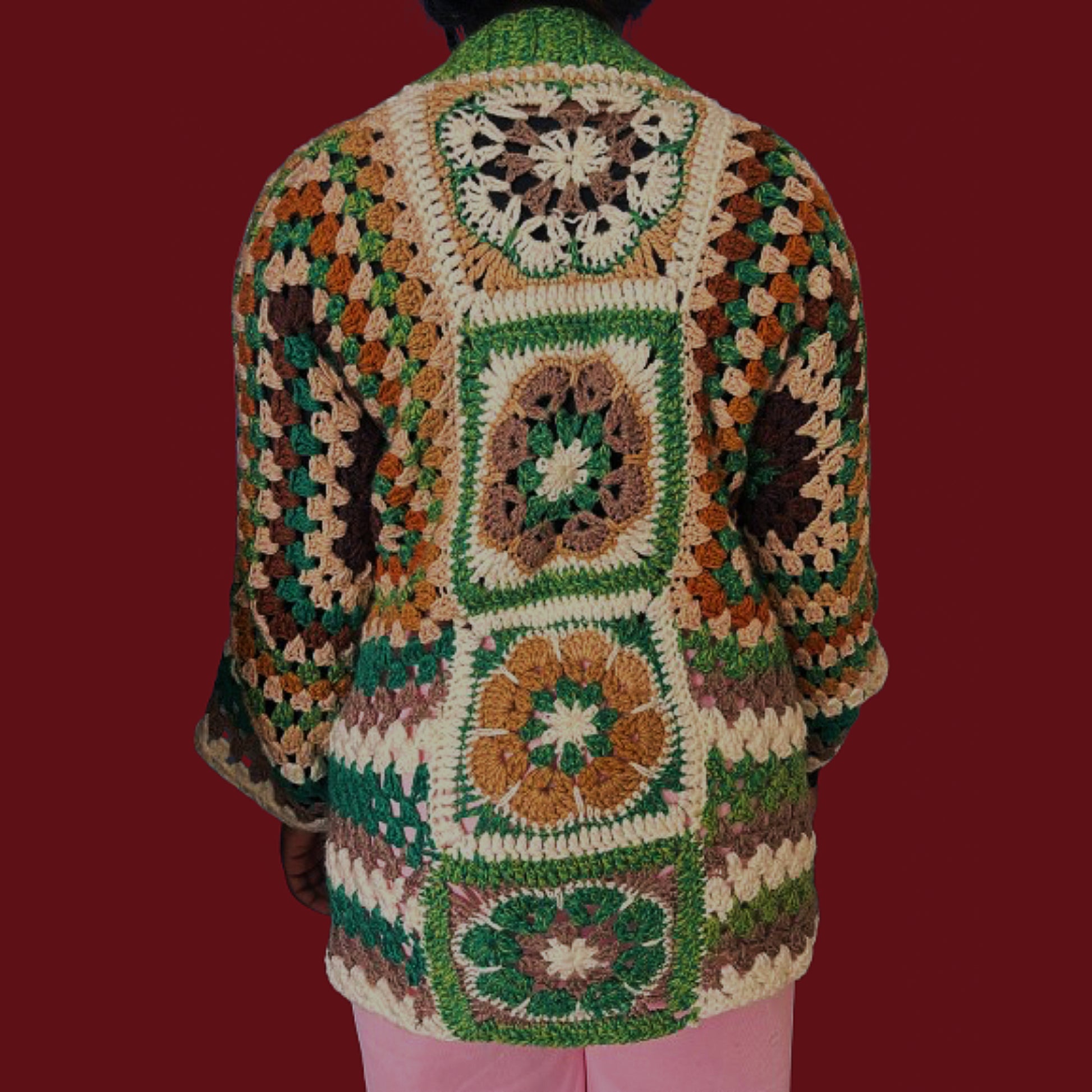 Crafted from a blend of acrylic and cotton mix yarn, it’s soft, durable, and perfect for layering through the cooler months. The intricate granny motifs and patchwork design make each piece truly one-of-a-kind, giving you both comfort and statement style in every stitch.